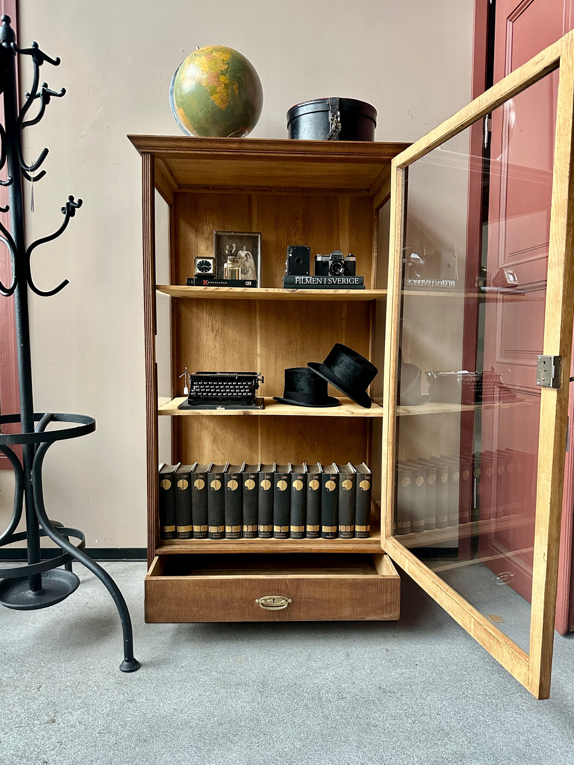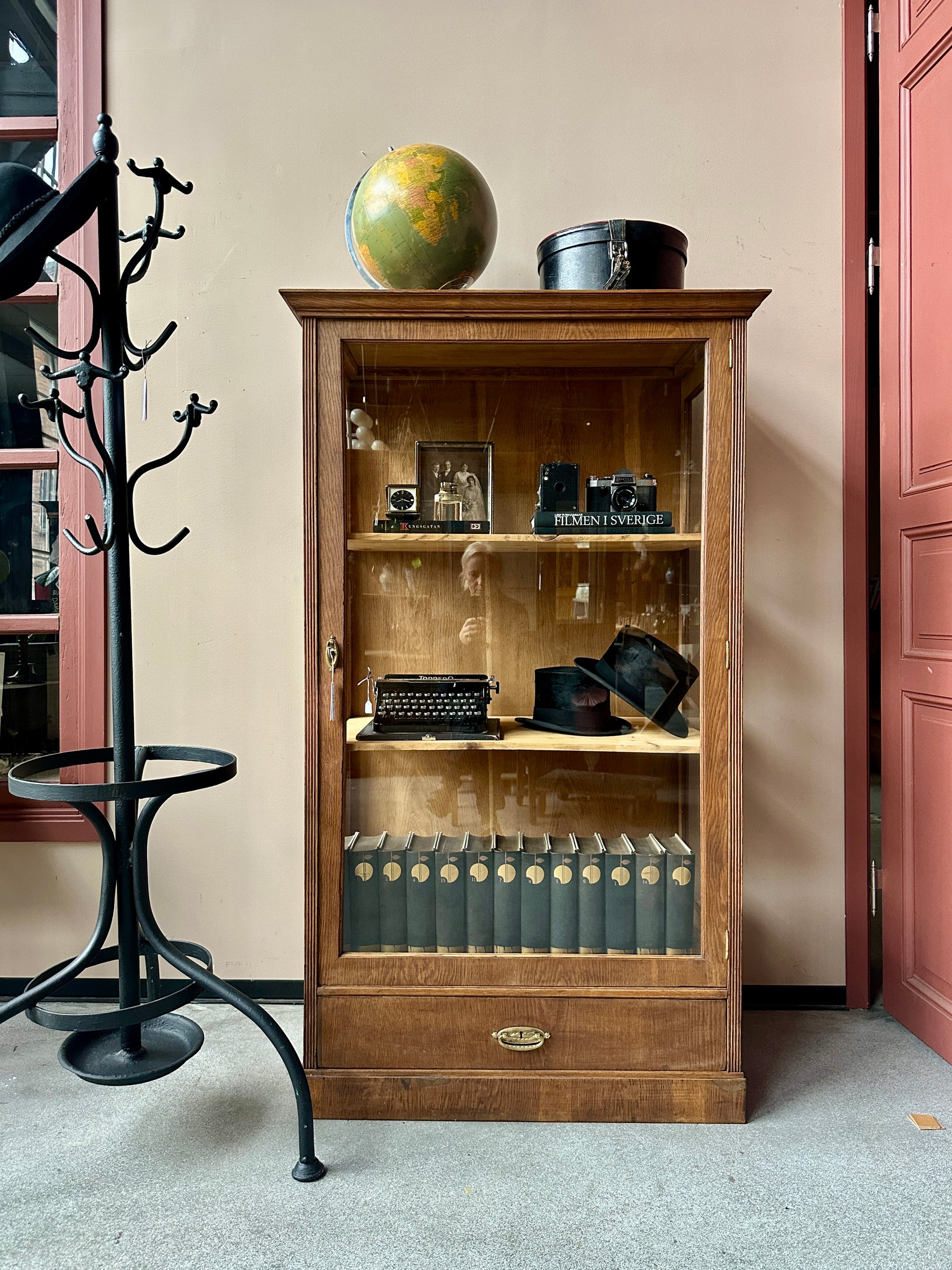 Ett gammalt, elegant vitrinskåp/displayskåp med ett fantastiskt ljusinsläpp tack vare glas både fram och i sidorna på skåpet. Skåpet har en stor dörr med helt glas framtill. Vår rekommendation är att skåpet ska förankras i vägg då det kan bli framtungt när dörren står helt öppen.