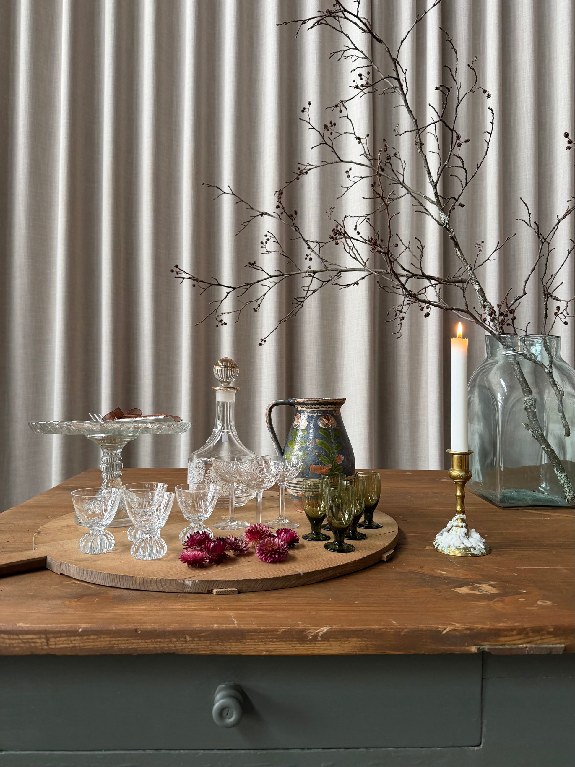 Bordet har återvunna skivor i furu som behandlats med pigmenterad hårdvaxolja för skydd.Underredet är penselmålat med en matt snickerifärg i Dakaboms mörkt Grågröna kulör.
