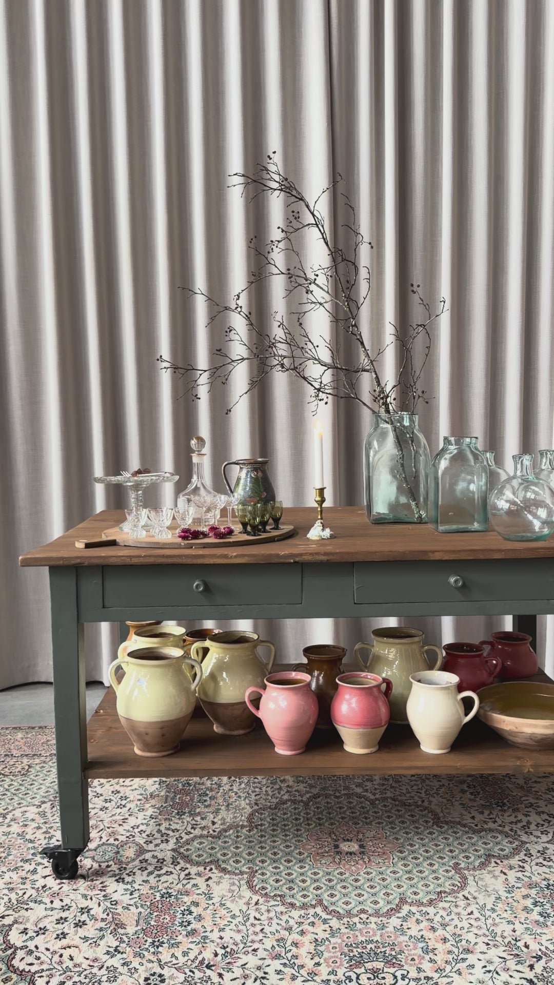 En vacker köksö/bord med fin patina. Det har en underhylla som rymmer massor samt två små lådor för förvaring samt en fin detalj. Köksön/bordet har hjul som går att låsa vilket är otroligt praktiskt & snyggt!