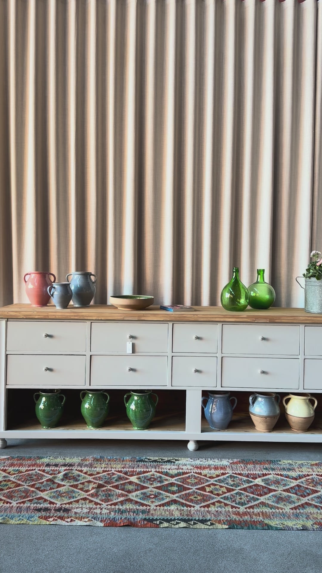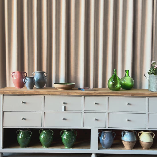 En vacker köksö/sidebord/bänk med 10 lådor med nya vackra porslinsknoppar i äldre stil och en underhylla för praktisk förvaring.