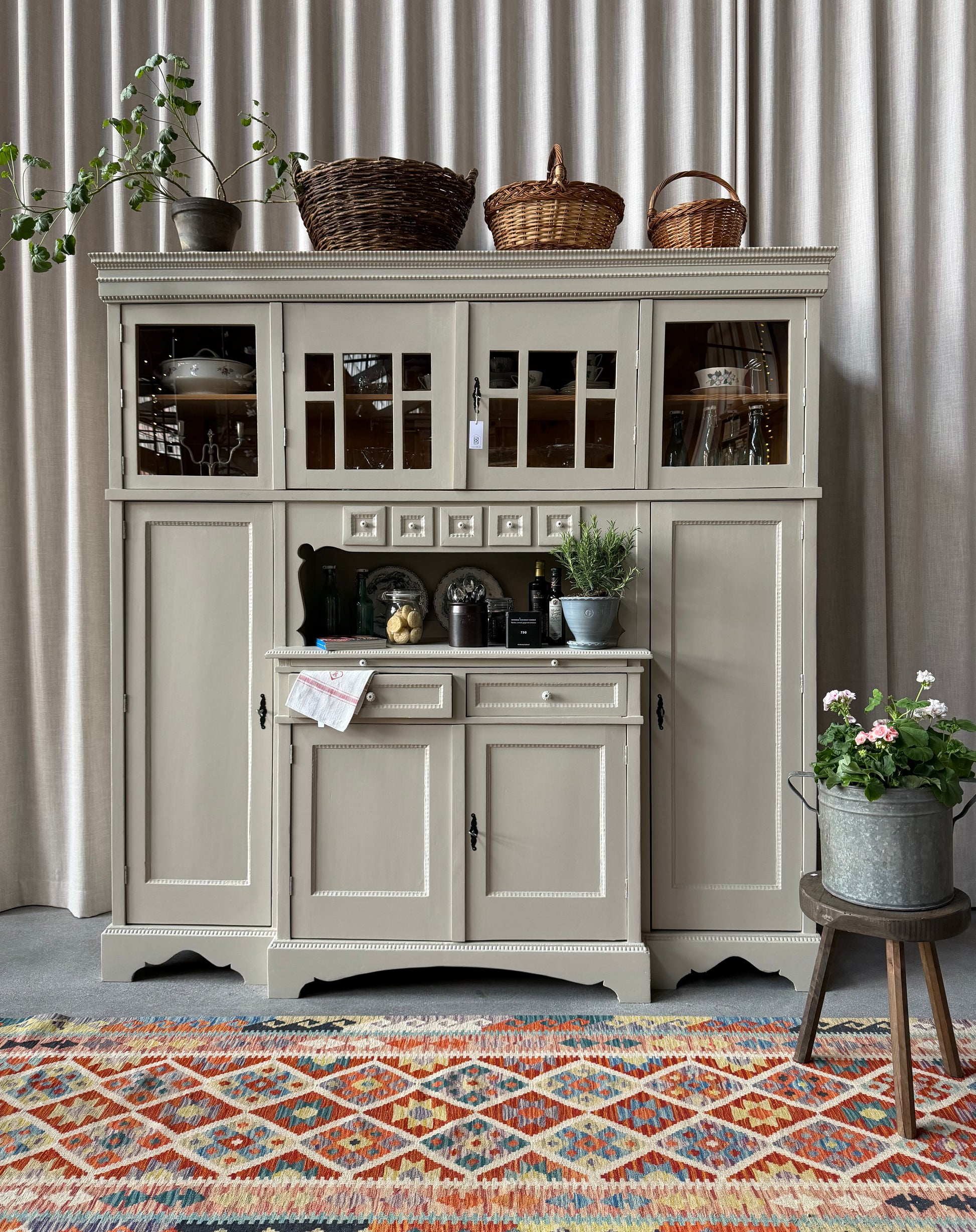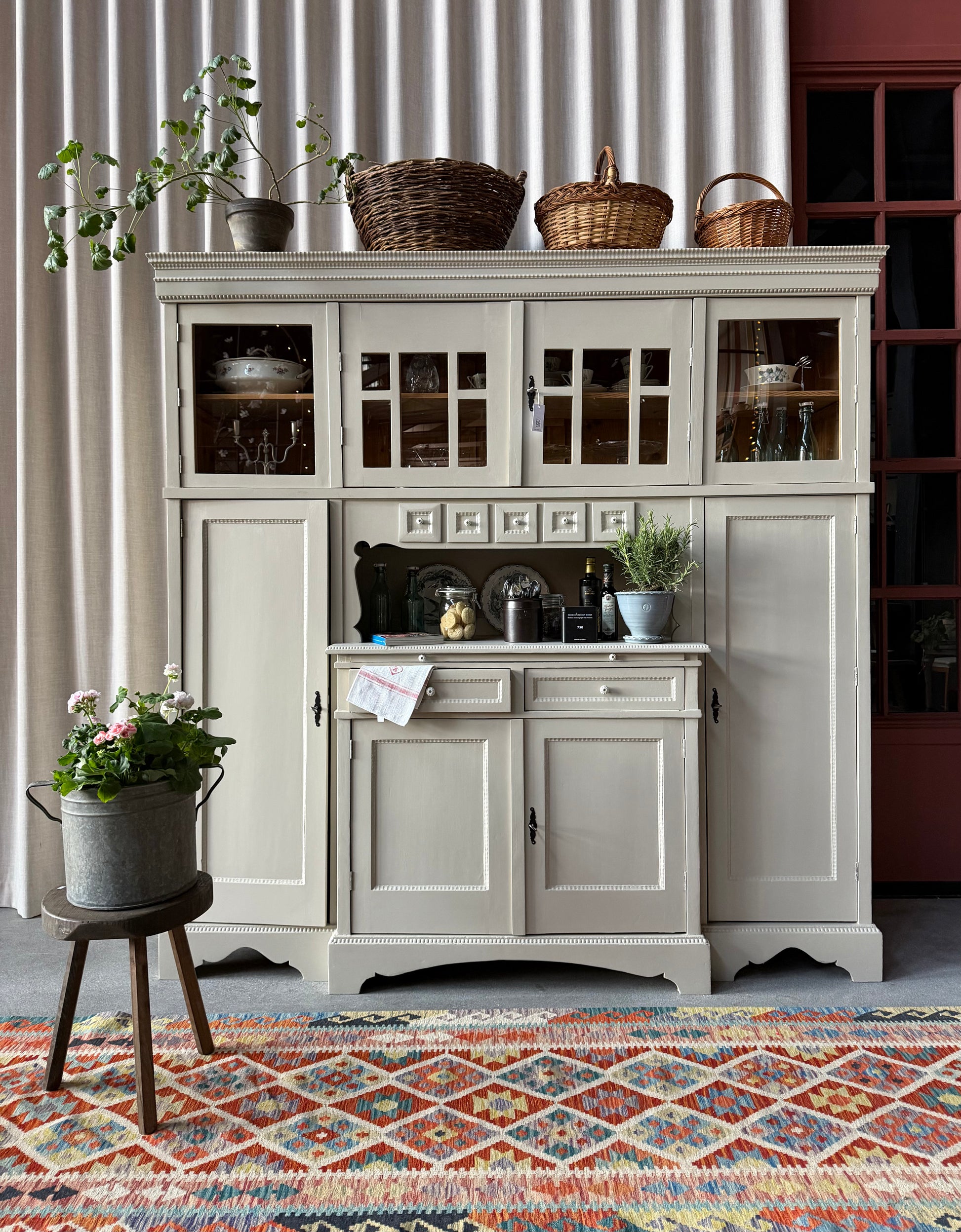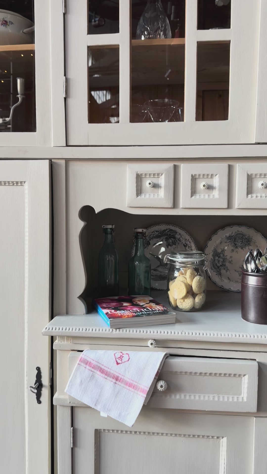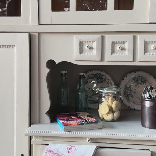 Förutom vitrin, täckta skåp och öppen avställningsyta så har detta köksskåp även 6 st ursöta söta små lådor samt två större lådor med knoppar i porslin. Skåpet har även en praktisk utdragbar träskiva för extra avställningsyta. Skåpets vitrindel har öppningsbara vikdörrar. För bästa funktion har vi bytt till nya lås samt beslag i äldre stil.