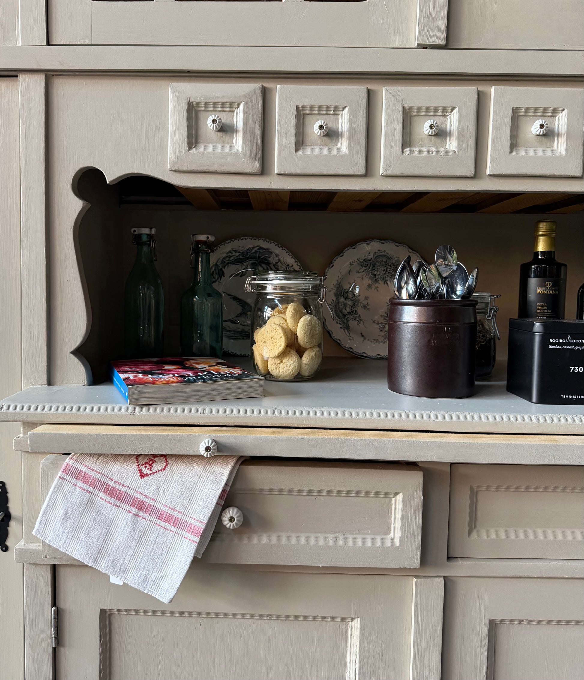 Skåpet är varsamt renoverat och sedan penselmålat med en matt snickerifärg i Dakaboms mörka greige kulör.