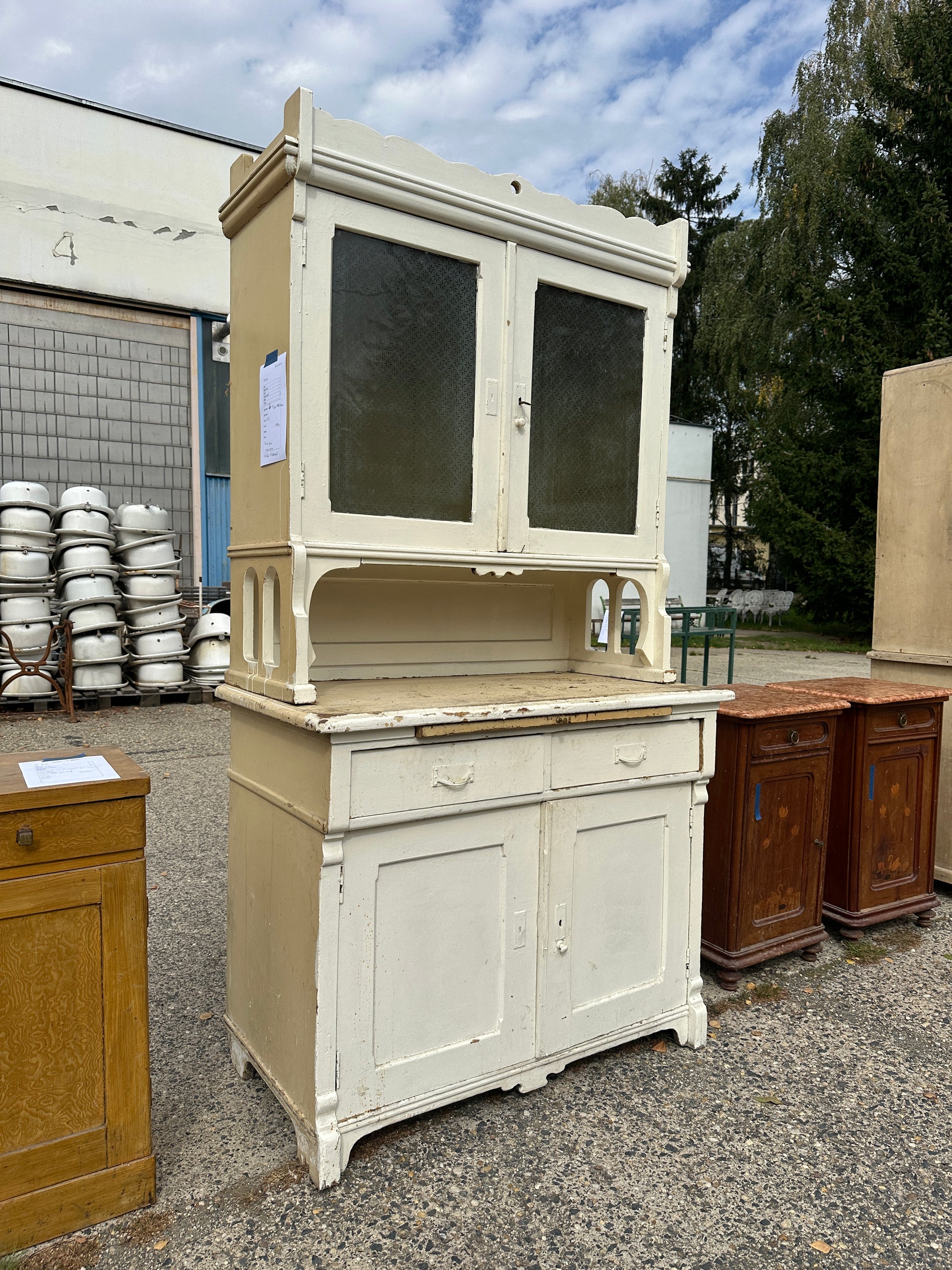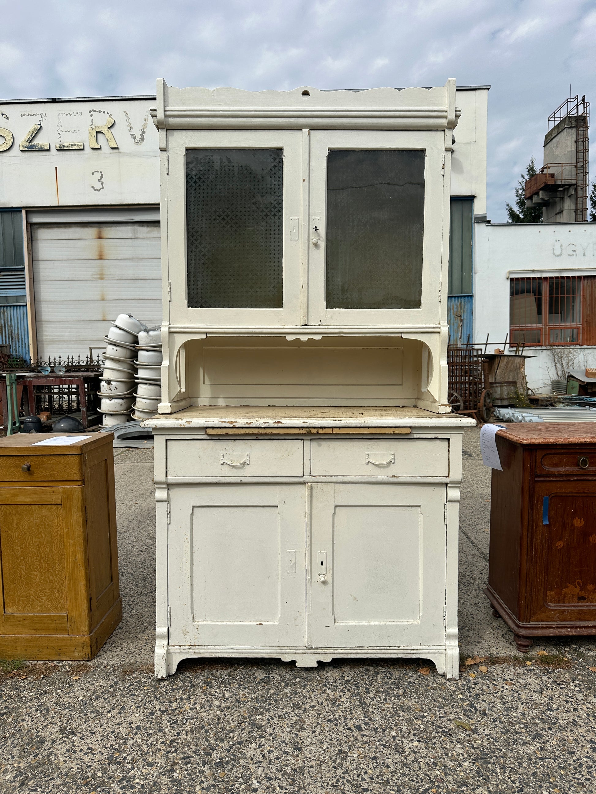 Ett gammalt vackert köksskåp med vackra detaljer. Skåpet har både vitringlas som kommer att bytas till klarglas, täckta dörrar och en avställningsyta. Det har även en praktiskt utdragsskiva.