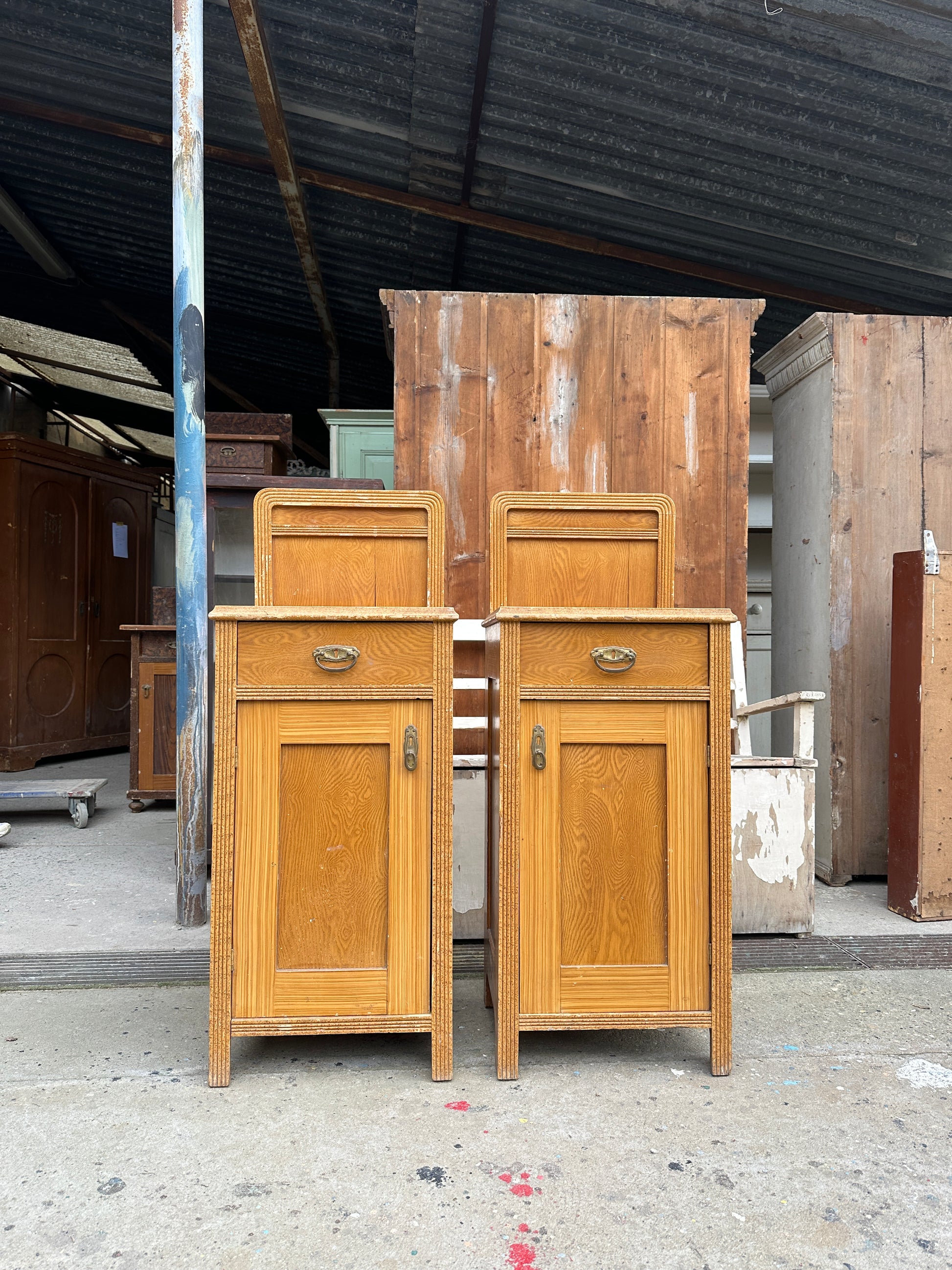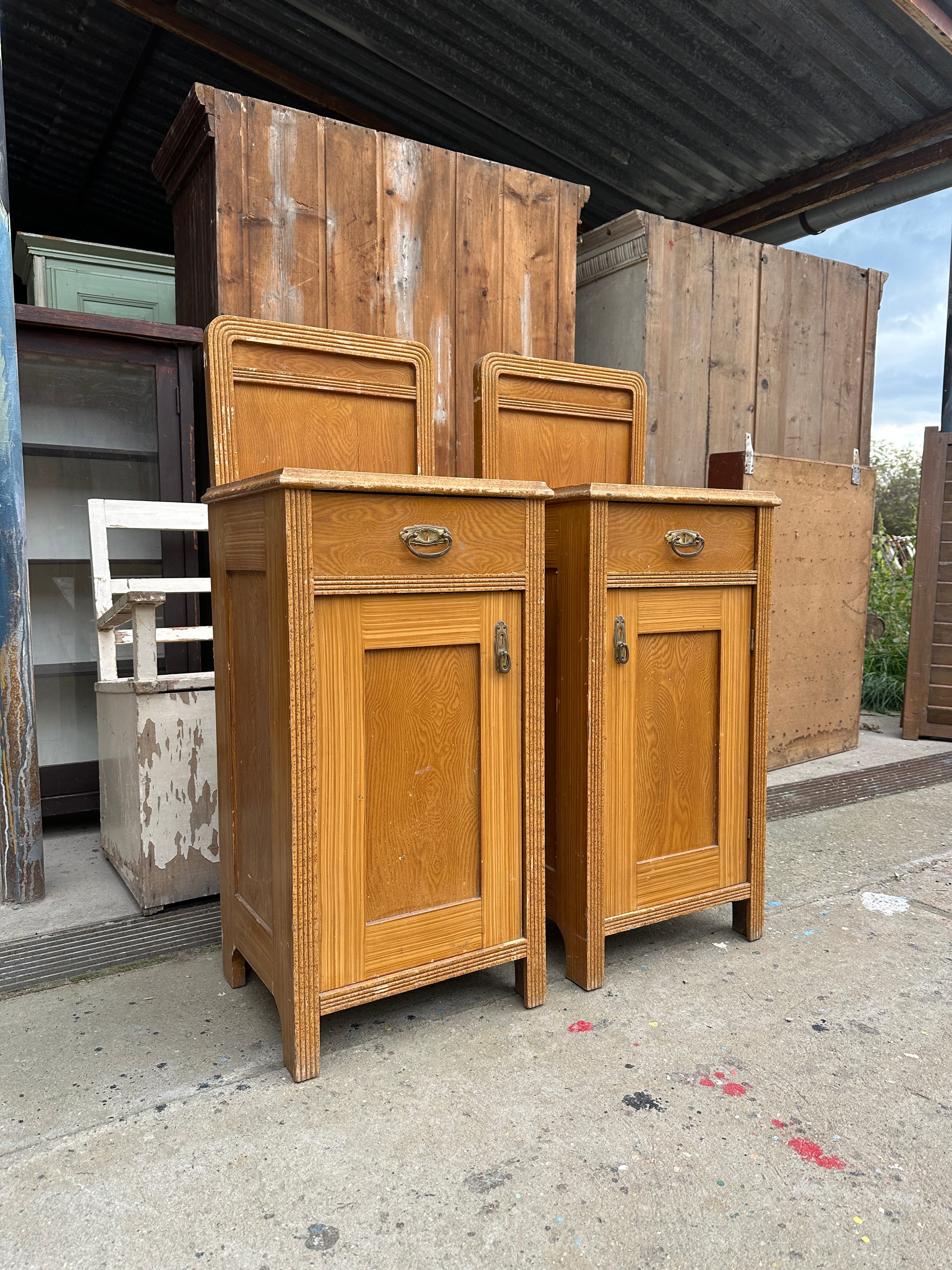 Ett gammalt vackert par med sängbord i trä. Sängborden har låda samt täckt skåp med en hylla i.