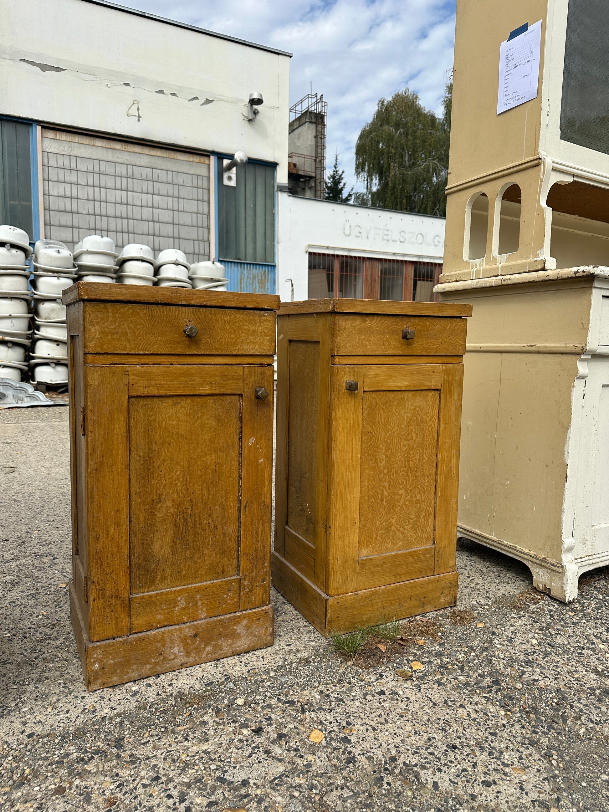 Ett gammalt vackert par med sängbord i trä. Sängborden har låda samt täckt skåp med en hylla i.