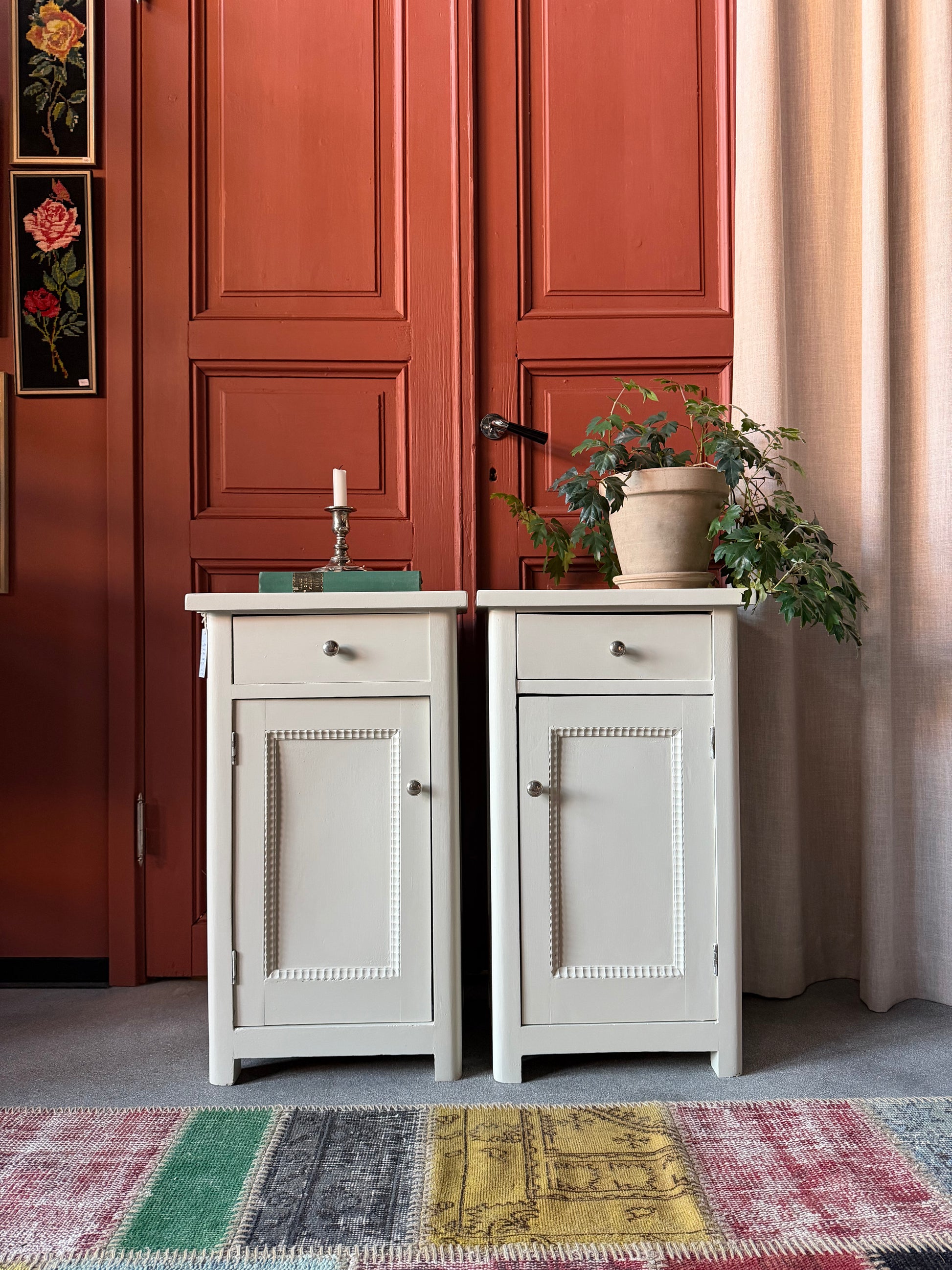 Två gamla otroligt vackra sängbord i enkel med stilig utformning och fina arbetade detaljer i speglarna samt med både låda och skåp. Både låda och skåp har fått nya knoppar i äldre stil.