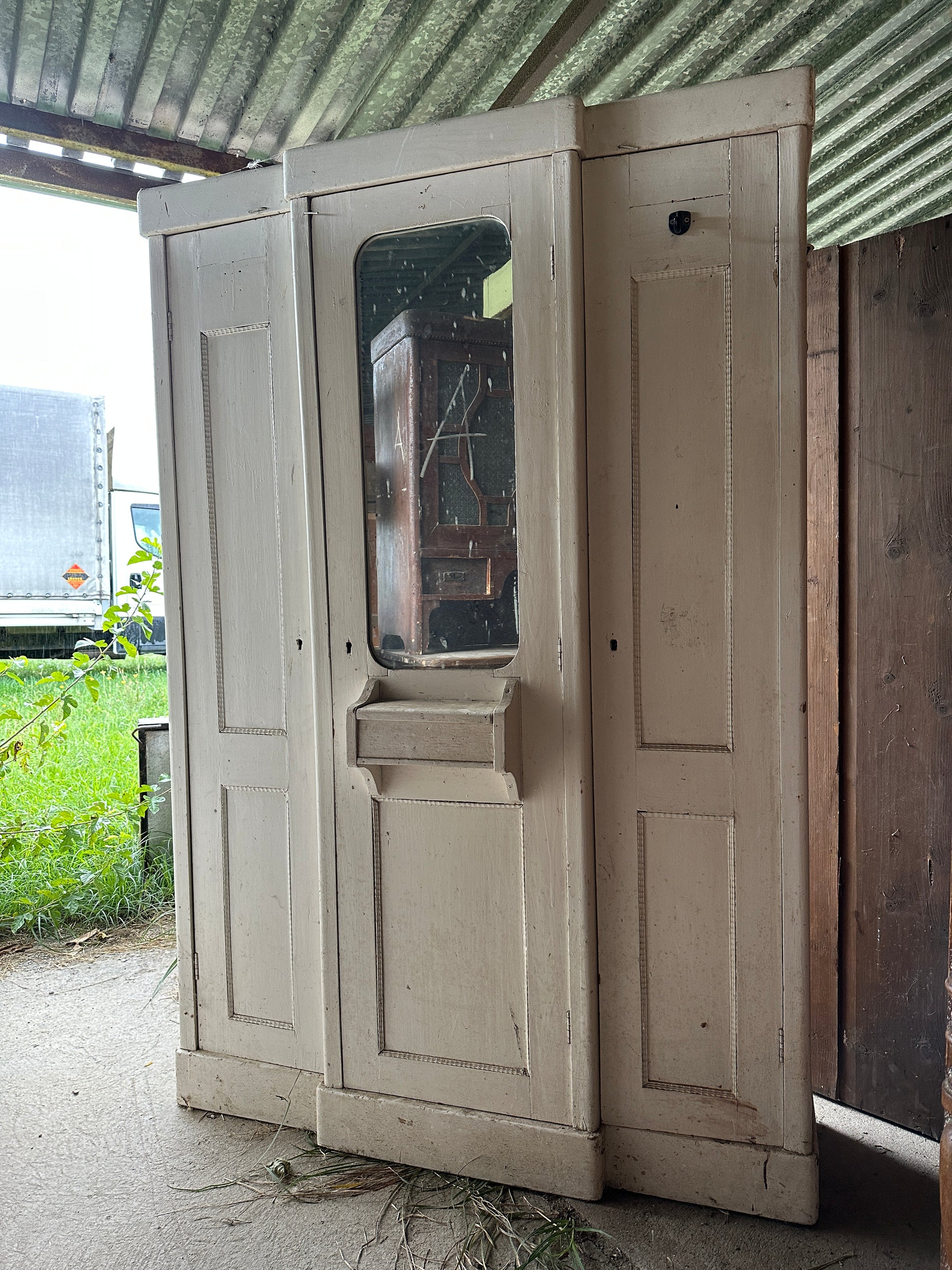 Ett gammalt vackert nätt skåp som är både grunt och inte så brett för att ha tre dörrar. Mittdelen sticker ut lite längre än vänster och höger del och har även en liten låda med lock som kan tas bort om man önskar. Vi tycker det kan fungera både som linneskåp eller som vitrinskåp.