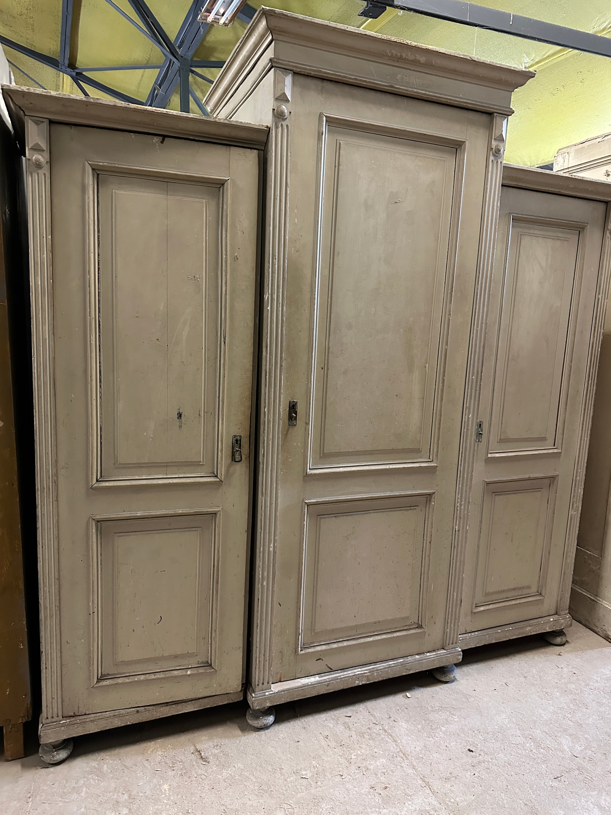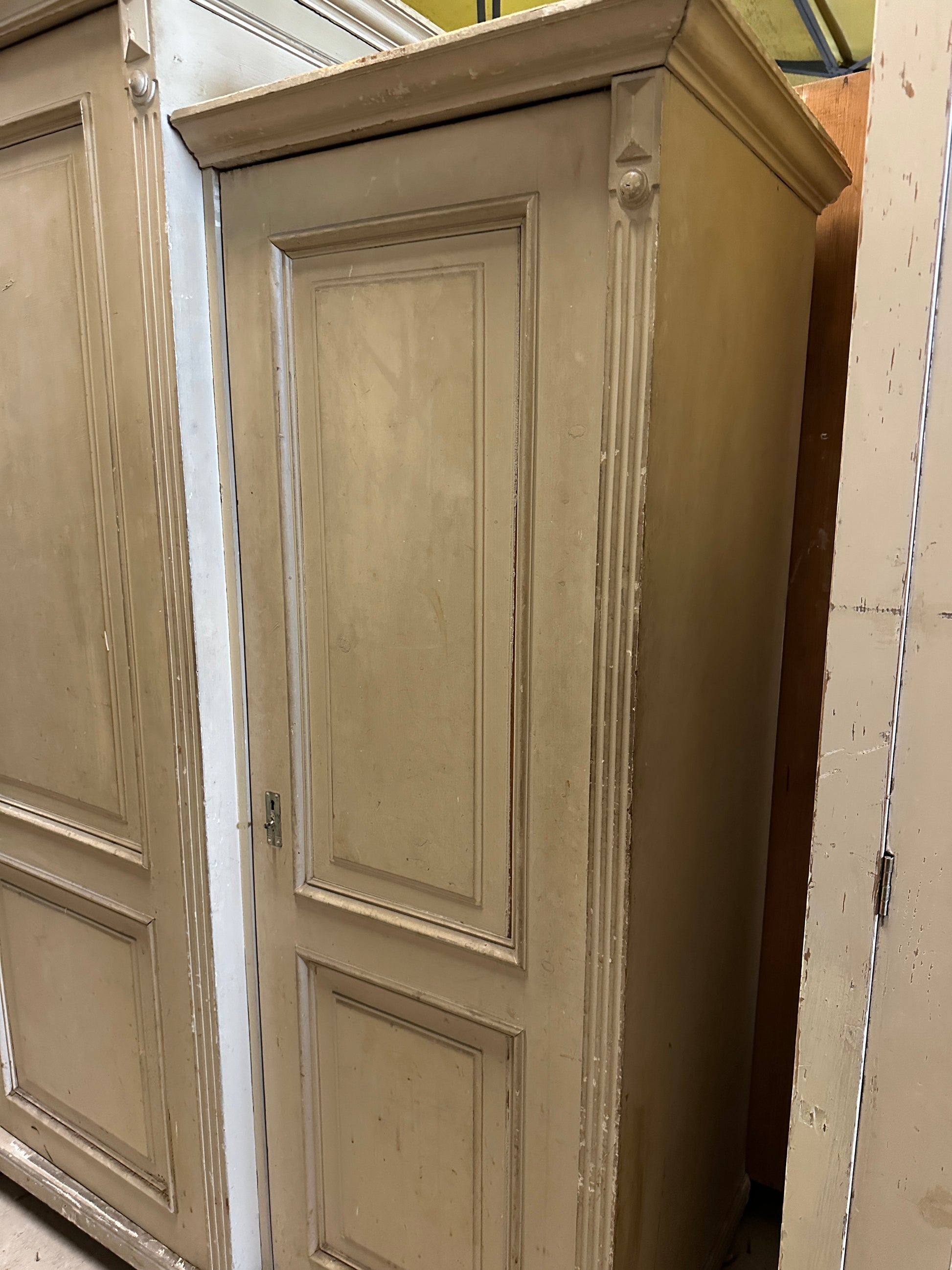 Det här är ett gammalt vackert och stort skåp i tre delar. Delarna skruvas lätt ihop till ett stort skåp men de olika delarna underlättar både transport och möblering.