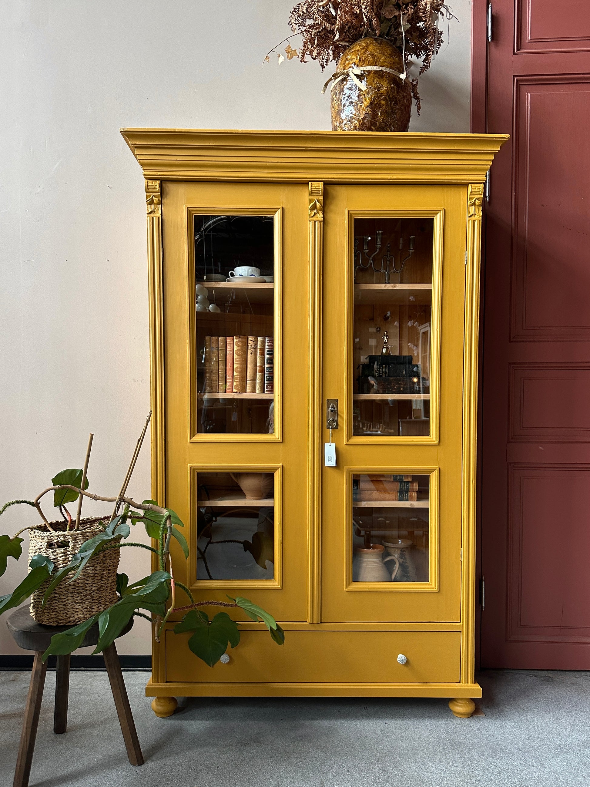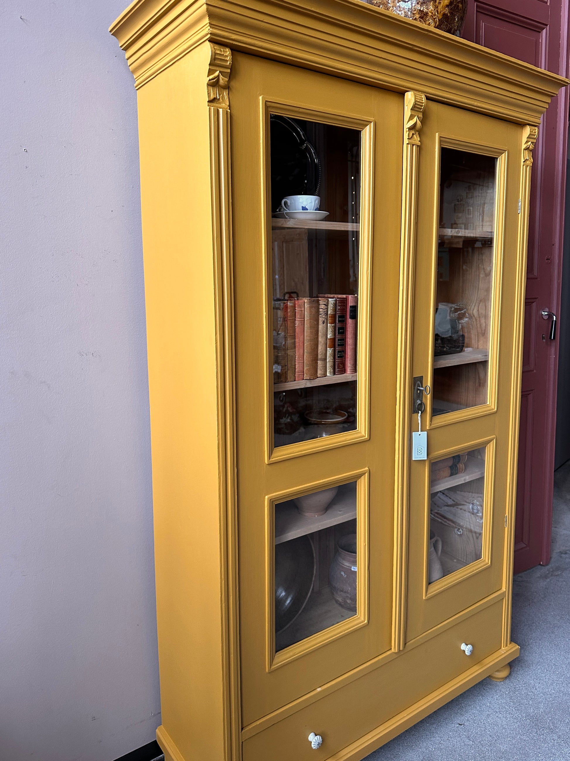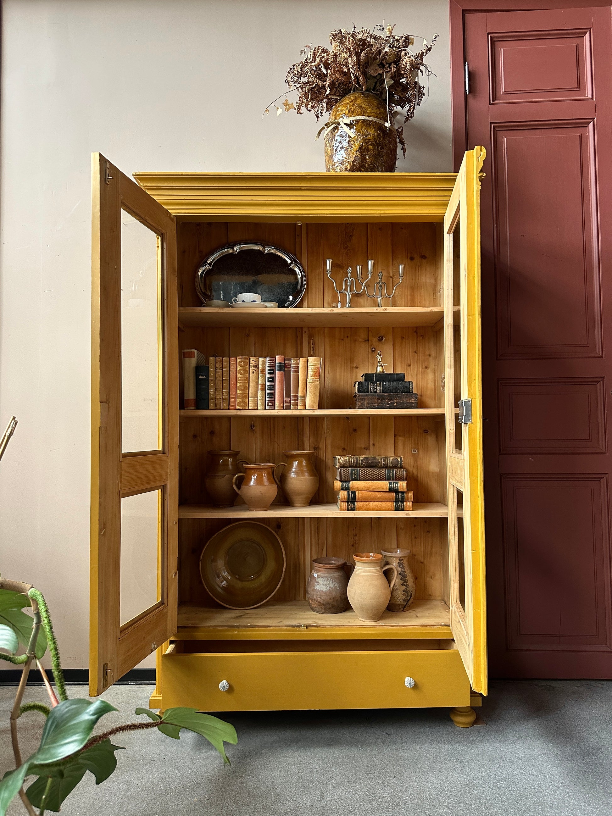 Skåpet är varsamt renoverat och slutligen penselmålat med en matt, vattenbaserad snickerifärg i dakaboms ockragula kulör.