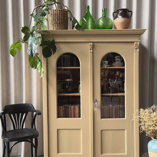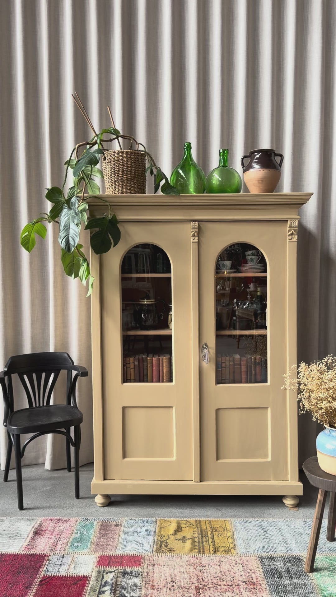 Ett gammalt, otroligt vackert vitrinskåp med fina detaljer i de rundade formerna och det arbetade krönet.