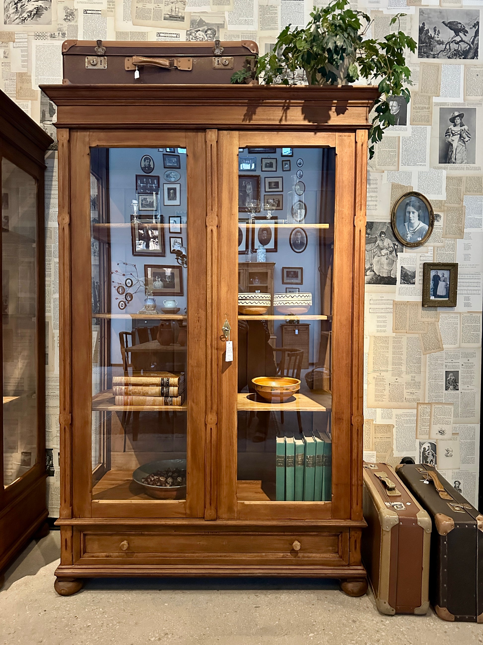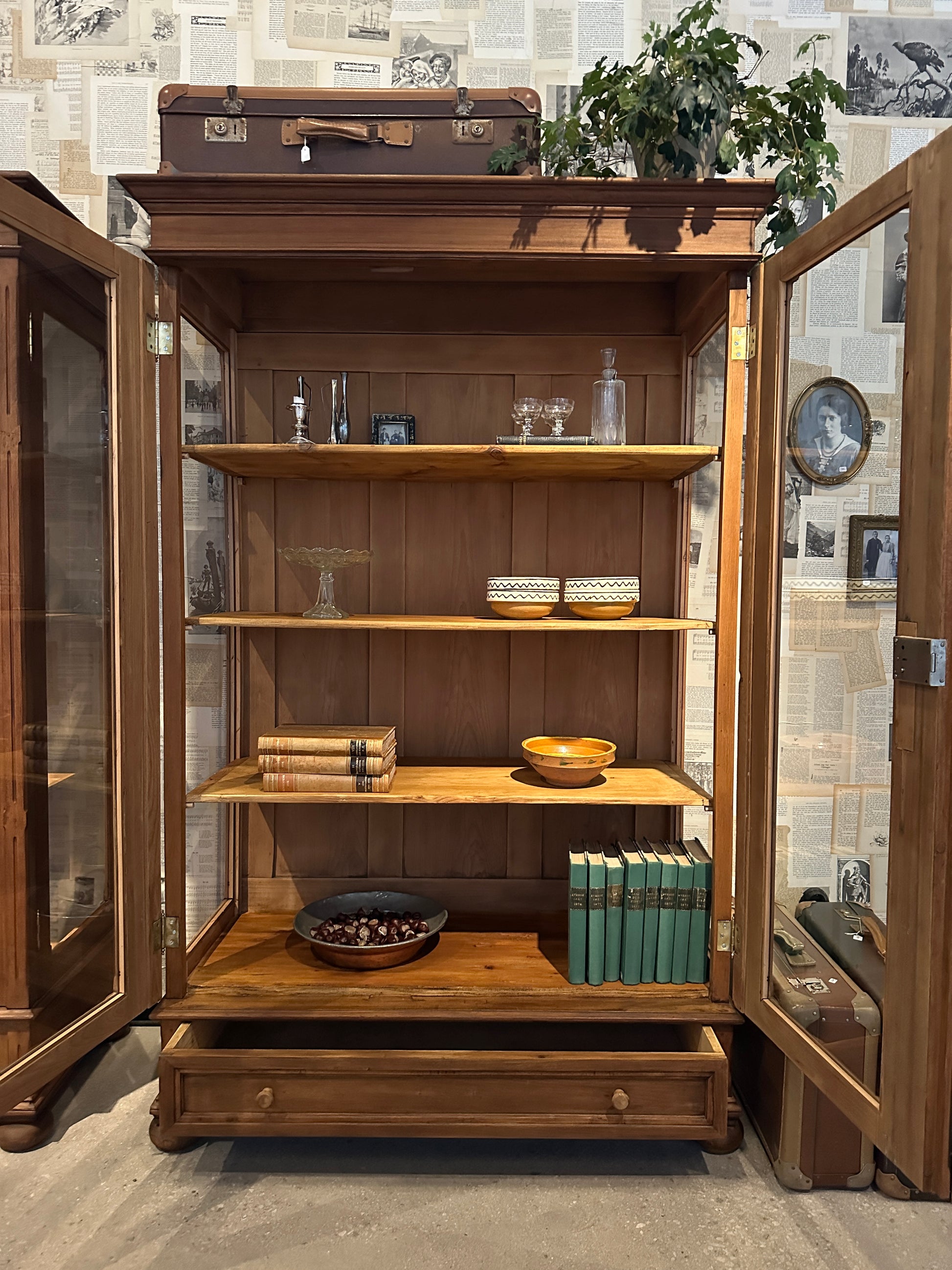 Ett gammalt vackert vitrinskåp med fint ljusinsläpp tack vare glas i dörrarna samt även i sidorna.